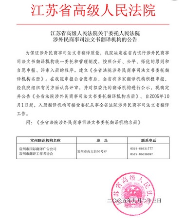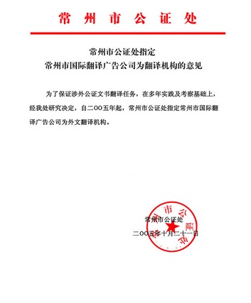 常州市國際翻譯廣告有限公司自2005年起,被設(shè)為江蘇省人民法院指定委托翻譯機(jī)構(gòu),省法制辦認(rèn)定翻譯機(jī)構(gòu),公證處指定翻譯機(jī)構(gòu)、國家外專局、公安局、工商局、房管局、出國簽證、留學(xué)、移民翻譯、外國大使認(rèn)證翻譯機(jī)構(gòu)。同時(shí)被國家外文局翻譯資格考評中心設(shè)立《翻譯專業(yè)資格水平考試》指定培訓(xùn)機(jī)構(gòu)。